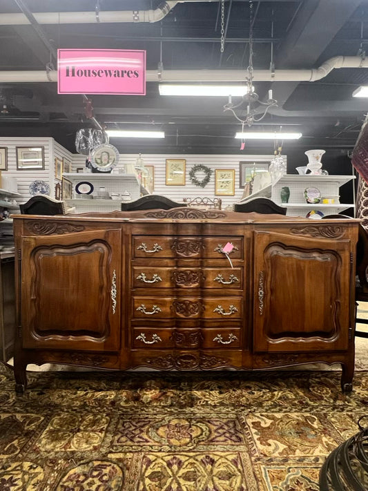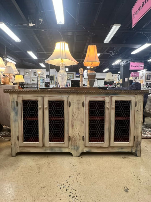 Whitewash & Blue Wood & Metal Credenza w/ Wire Doors