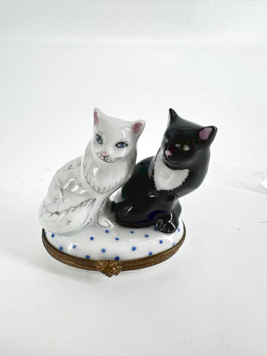 LIMOGES White & Black Cat Couple Ceramic Trinket Box