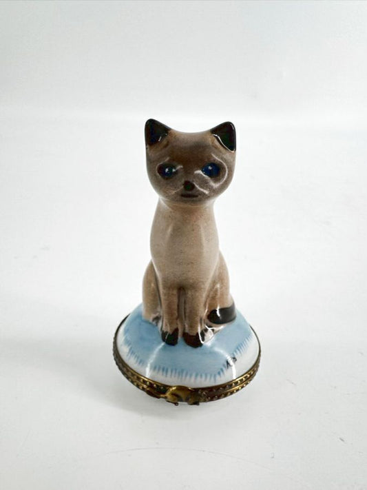 LIMOGES Gray & Blue Siamese Cat Ceramic Trinket Box