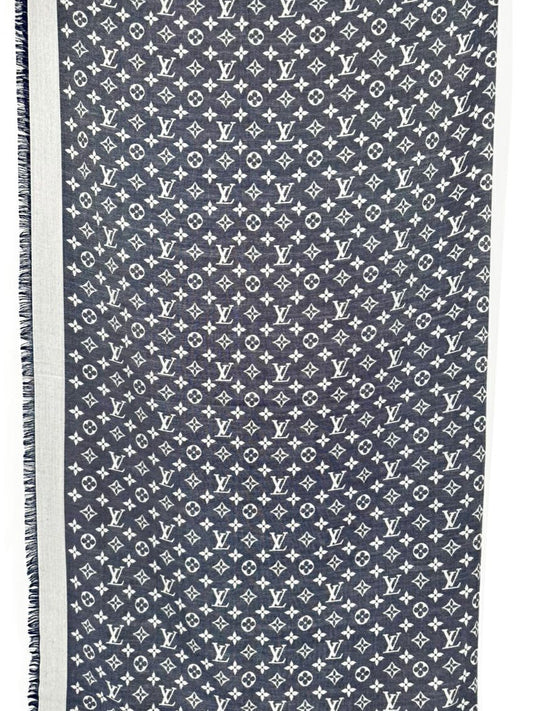 LOUIS VUITTON Blue & Gray Logo Silk & Wool Blend Scarf